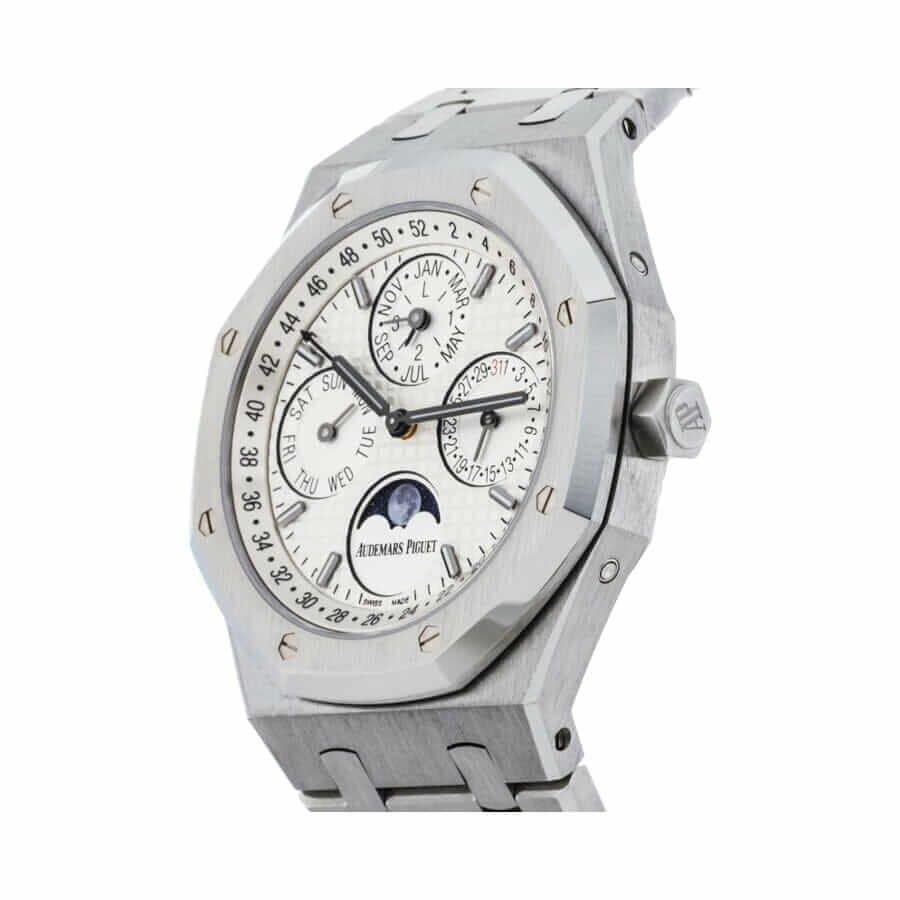 The Audemars Piguet Royal Oak Perpetual Replica is a striking watch. It features a 904L stainless steel case and bezel. with a sapphire crystal and adjustable links. The movement is an automatic AP 5134 caliber with a power reserve of 60 hours and a precision of (-3/+3 sec/day) within COSC certification limits. The dial is silver with stick and dot indices. and Royal Oak hands. It also has a moonphase. date. day. leap year. month. and week indicator.This watch is water-resistant up to 30m and comes with a full 2 year international warranty. It is a 1:1 super clone Swiss mechanism watch. with the same arrangeable serial numbers and cards. font. punto. and finishing for writings and markings. thickness. and size as the authentic watch. Your jeweler won’t be able to tell the difference! Japanese mechanism watches may have different materials and movements. so please contact our support team for more information.