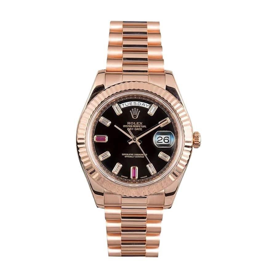 The Rolex Day-Date II 218235 KW Rose Gold Black Dial Replica is a luxurious and sophisticated watch. It features a 904L stainless steel case with a rose gold color and a sapphire crystal. The movement is an automatic caliber 3156 with a power reserve of 60 hours and a precision of (-3/+3 sec/day) within COSC certification limits. The bracelet is also made of 904L stainless steel with an oyster type and adjustable links for all sizes. The dial is black with gem-set and stick indeces and 904L stainless steel hour-markers and hands.The watch also features functions such as hours. minutes. seconds. date. day. and chronometer. It has passed the 30m water resistance test and is protected by a full 2 years International Luxury Moment warranty. It is a perfect replica of the authentic watch. with the same arrangeable serial numbers and cards. font. punto. and finishing for writings and markings. thickness. size. and powerful movement and caliber.